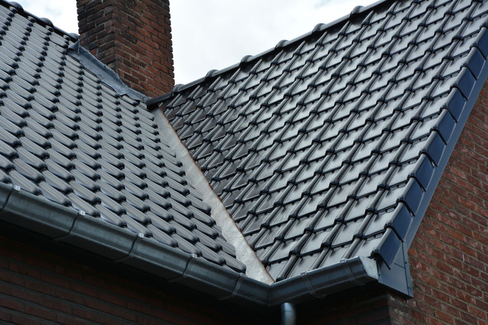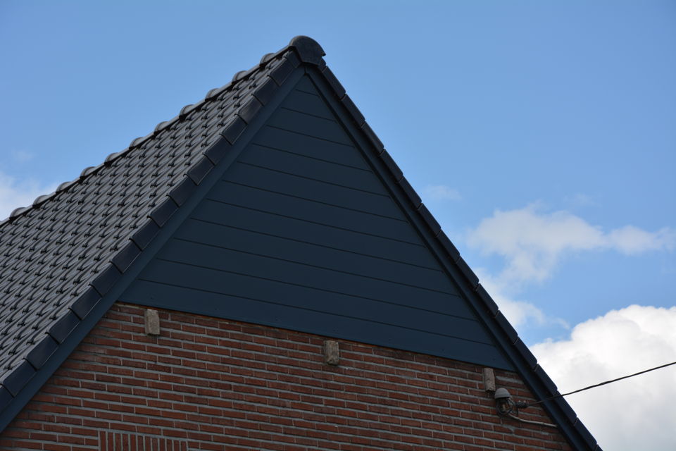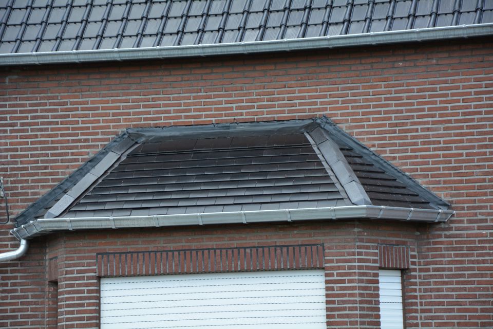 Renovatie van een bestaand dak en plaatsen van een daktimmer met pannen op de achterbouw. De bakgoten werden vervangen door zinken hanggoten en de puntgevel werd bekleed met plastiek.